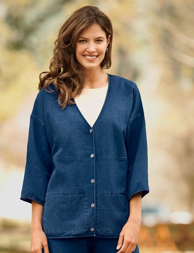 Enjoy the look of denim in a stretchy cotton knit. This roomy kimono-style cardigan has a button front, three-quarter-length sleeves, a V-neckline, and two deep pockets. Tonal topstitching. Knit denim cardigan in indigo. Cotton/spandex. Washable. Imported. Sizes: S(6-8), M(10-12), L(14-16), XL(18-20); about 28" long.